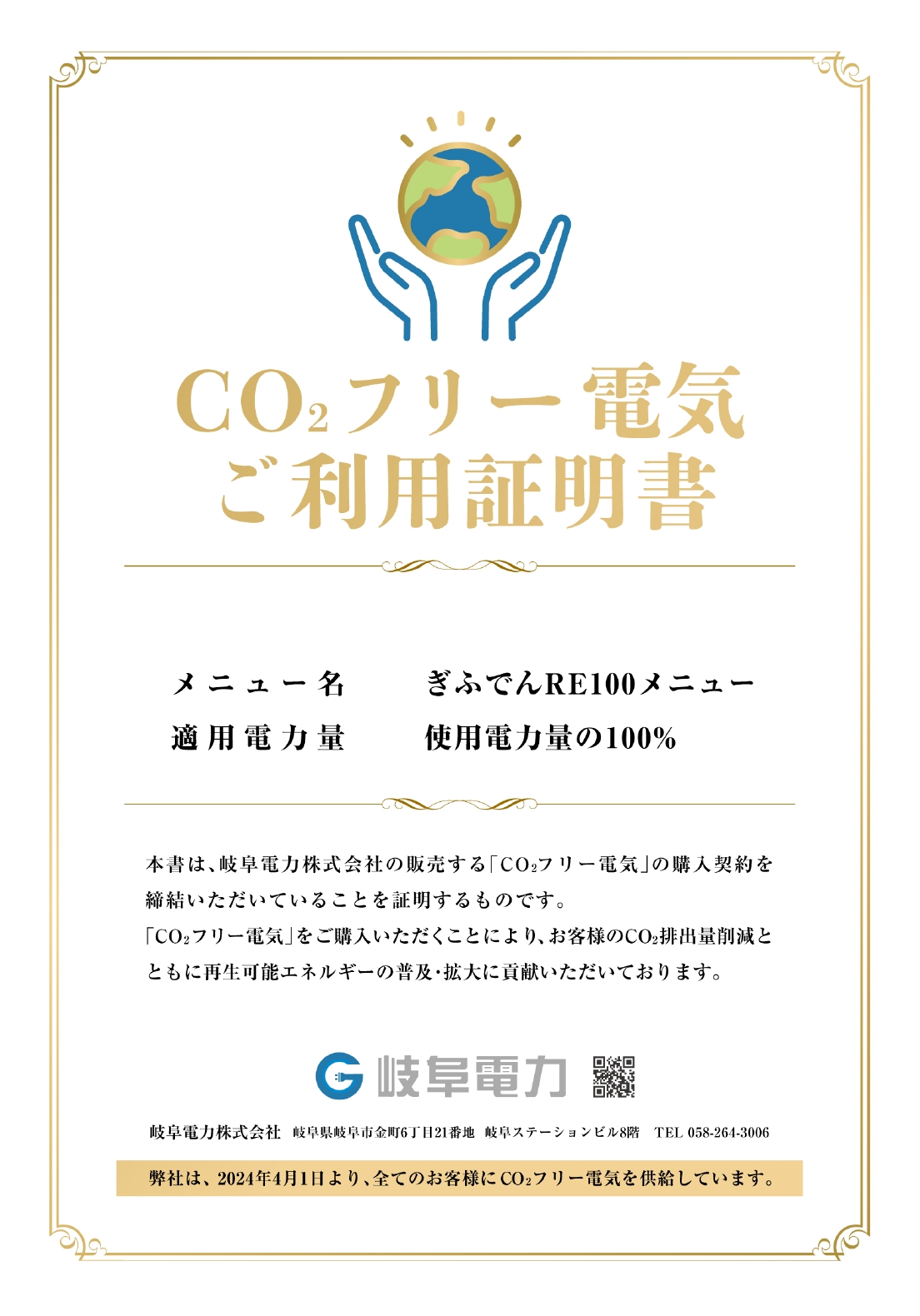 地元である岐阜電力さんが、RE100に対応したトラッキング付き非化石証書を活用したCO2フリー電力を提供していると知り相談しました。電力供給だけでなく、証明書の発行まで一貫してサポートいただけること、そして何よりも地域に根差した企業としての信頼感が決め手となりました。